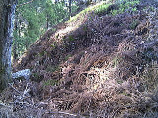 | 国道151号と国道301号が交差する「杉山北」信号を作手方面へと北へ入ります。そのまま国道301号を2km程行くと「下臼子」のバス停があります。このバス停の少し手前が城の入口で幟が立っています。道路の反対側にも幟があり、城見学者用の駐車場だと思います。 |