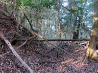 ここから登ると城の西尾根から取り付くことになり、神社跡のような雰囲気です。城は主郭の周囲に横堀が巡り、西側に堀切が、土塁には石積みが見られます。尚、突当りから南東へ進んで山へ入ると「宮口古墳群」があります。この南側からも城へ行けますが道は無く、竹薮を直登することになります。
