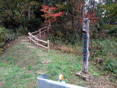 | 国道472号「新蛤橋」で宮川を北へ渡ってすぐを左折し県道471号に入ります。1つ目の路地を右折し、50m程西進すると「百足城」の案内が出ているのでそれに従うと城です(南麓登城口)。最後の砂利道を入った先に駐車しました。また、城の西側・県道90号からも城への入口があり(高野公園の案内有)、広い路側帯があります。 |