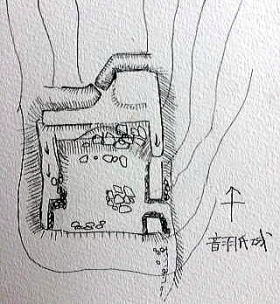 | 登城口から城まで案内が行き届き、道や城内も整備されています。城は単郭で西〜北〜東の三方に大土塁があり、北側はかなり高く櫓台のようです。この大土塁にも石が積まれた箇所があり、郭内には崩落したと思われる石があったりします。東側の虎口にも大きな石を用いた石垣があり、櫓台背後には空堀もあります。こじんまりとした城ですが、面白味のあるおススメのお城です。尚、この南西尾根先端には音羽北出城もあるので、セットで回るとよいでしょう。(尾根伝いに行かず、再度登り直した方が良いです) |